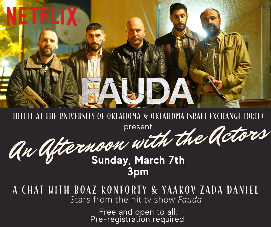 Join the OKlahoma Israel Exchange (OKIE) and Hillel at The University of Oklahoma for "An Afternoon with the Actors" featuring the two of the stars of Netflix's hit tv series "Fauda". Chat with Boaz Konforty and Yaakov Zada Daniel about their unique journey to become actors, the significance of Jews and Arabs collaborating in the name of Art and the impact of the TV series on Arabs, Israelis, and Jews.