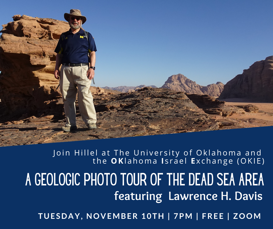 Join Hillel at The University of Oklahoma and the OKlahoma Israel Exchange (OKIE) for A Geologic Photo Tour of the Dead Sea Area featuring Lawrence H. Davis.