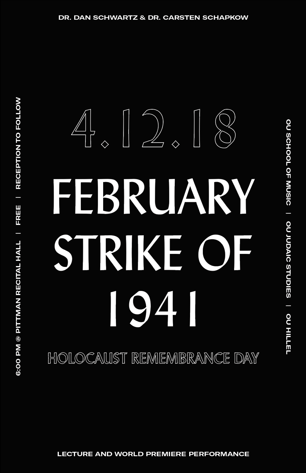 OU Hillel, OU School of Music and OU Judaic Studies are co-sponsoring a performance, lecture and dessert banquet for Holocaust remembrance day on April 12, at 6pm. Dan Schwartz, professor of oboe at the University of Oklahoma, and musician in the Oklahoma City Philharmonic, will be performing. This lecture recital will be centered on the February Strike of 1941, a strike in Amsterdam carried out by thousands of Dutch and non-Jews against Nazi occupation (the only direct strike of its kind in World War II). The evening will explore themes of meaningful remembrance, power of the bystander, and making the ultimate sacrifice. The event will be a world-premiere performance of an original composition for oboe and electronics, lecture, and audience discussion. This lecture recital is presented in collaboration with Dr. Carsten Schapkow of OU Judaic Studies