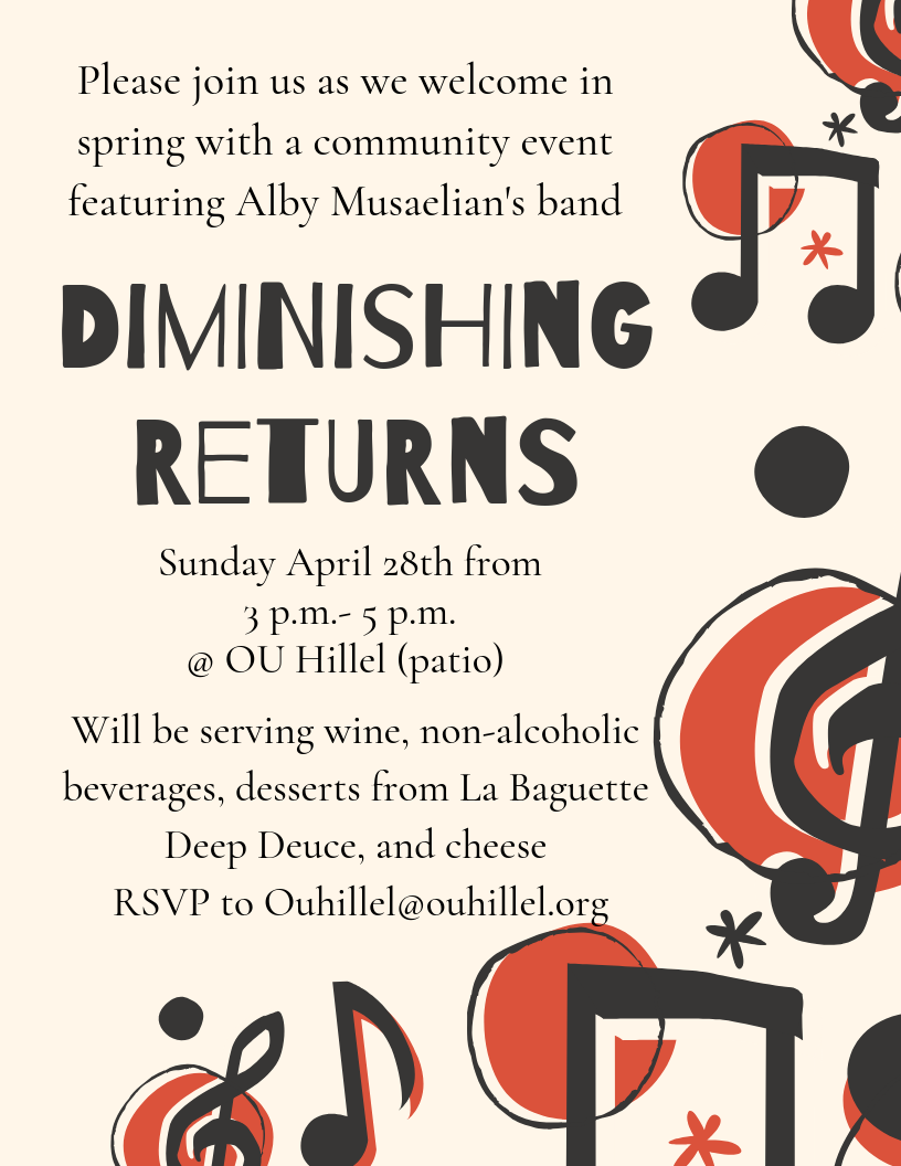 OU Hillel Staff and Students cordially invite you to join us as we welcome in spring. Our very own student, Alby and his Jazz band will be playing live on the patio throughout the event. This is a great opportunity to meet our students, staff, and your community.