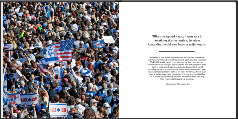 We present this book to you and the Israeli people as a symbol of our unity and unwavering commitment. The messages and photos represent a small example of the love, hope, and solidarity of our communities across North America with the Israeli people. Let this book serve as a reminder that you are not alone, and that the bonds uniting us are stronger than any force seeking to divide us.